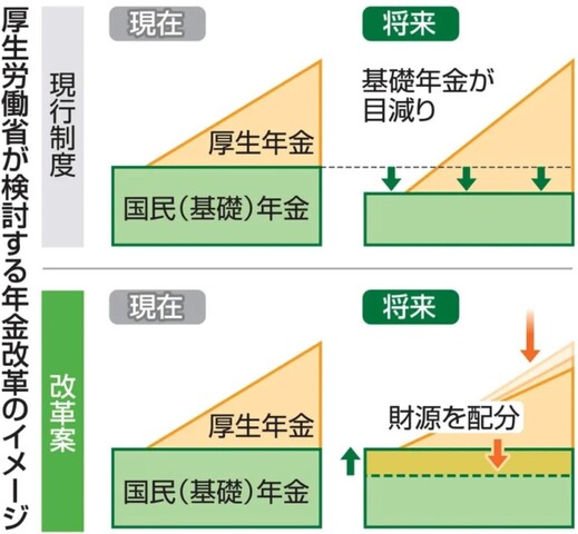 5年に1回行う年金財政検証の次回2024年に具体的な財源配分方法を示し、25年に改正法案の提出を目指す。ただ高収入の会社員は将来の年金水準が現行制度に比べ下がることになるため、経済界の反発も予想される。田村氏は会見で「所得の低い方々に手厚い年金に変わり、非常に意味のある改革になる」と強調した。