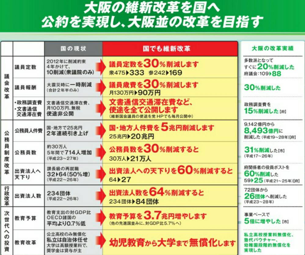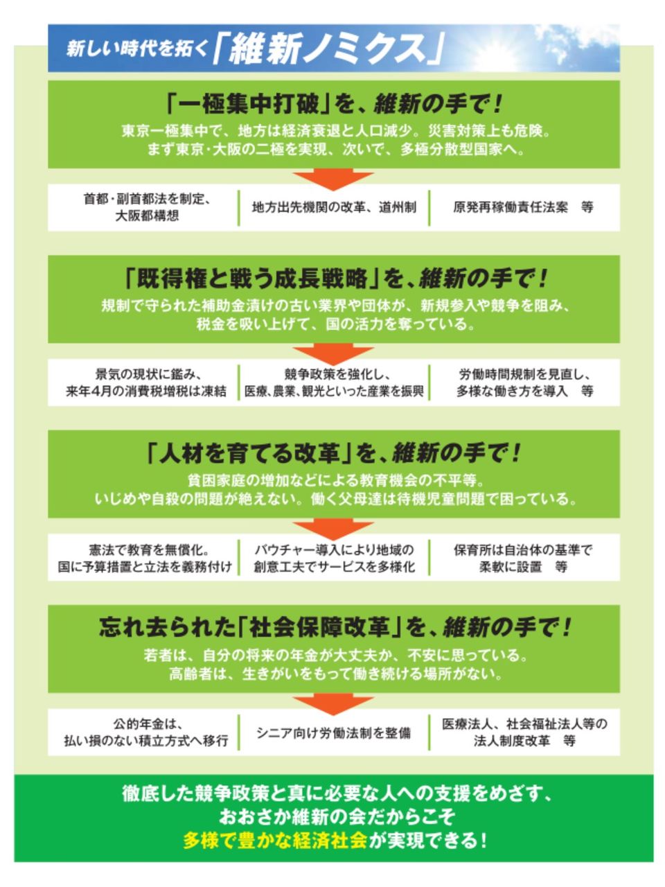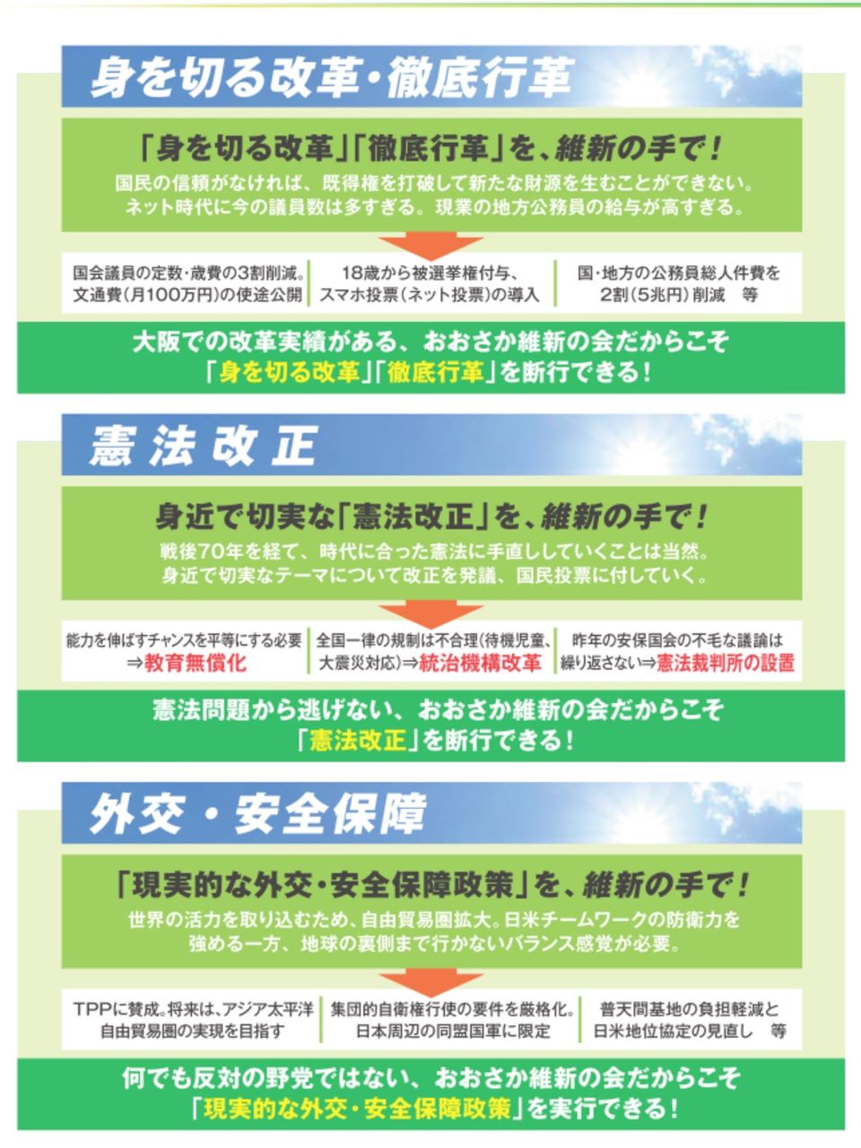 おおさか維新の会は、他の既存政党の選挙公約とは違い、“維新”を前面に出し「新しい日本」を目指す未来志向なものであると思います。「企業・団体献金の禁止」やその他議員・公務員の身を切る改革など、既存の政党の“財源”を断つことも実行してくれます。「圧力団体・政治家・官僚」の鉄の三角形により成り立つ古い政治体質を変えられるのは、おおさか維新の会しかないですね。