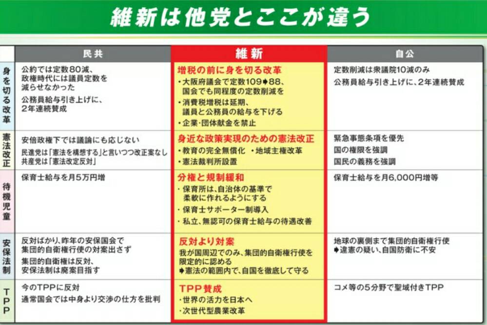 TPP賛成や維新ノミクスにより、自民党と対等以上の経済対策案を提示。