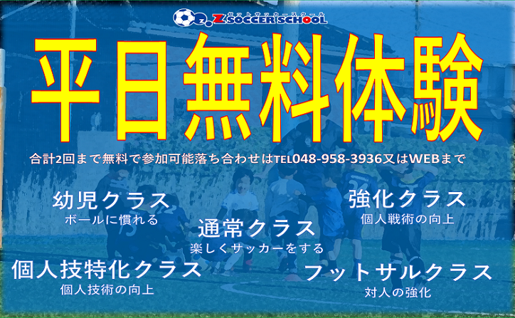 そんな中Zサッカースクールでは平日のスクールが随時2回まで無料で体験できます!