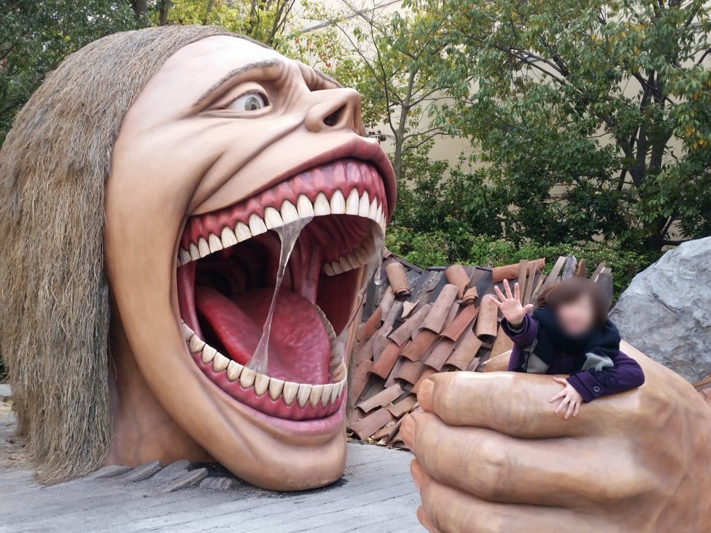 アトラクション内容に期待できないかわりに、外の捕食巨人の出来はとても良い。なかなか良い写真が撮れるので、ぜひ、捕食巨人につかまれ、食われそうになっている写真を撮って帰って欲しい。撮影は、スタッフの持っているカメラと、自分のカメラやケータイなどでも撮ってもらえる。