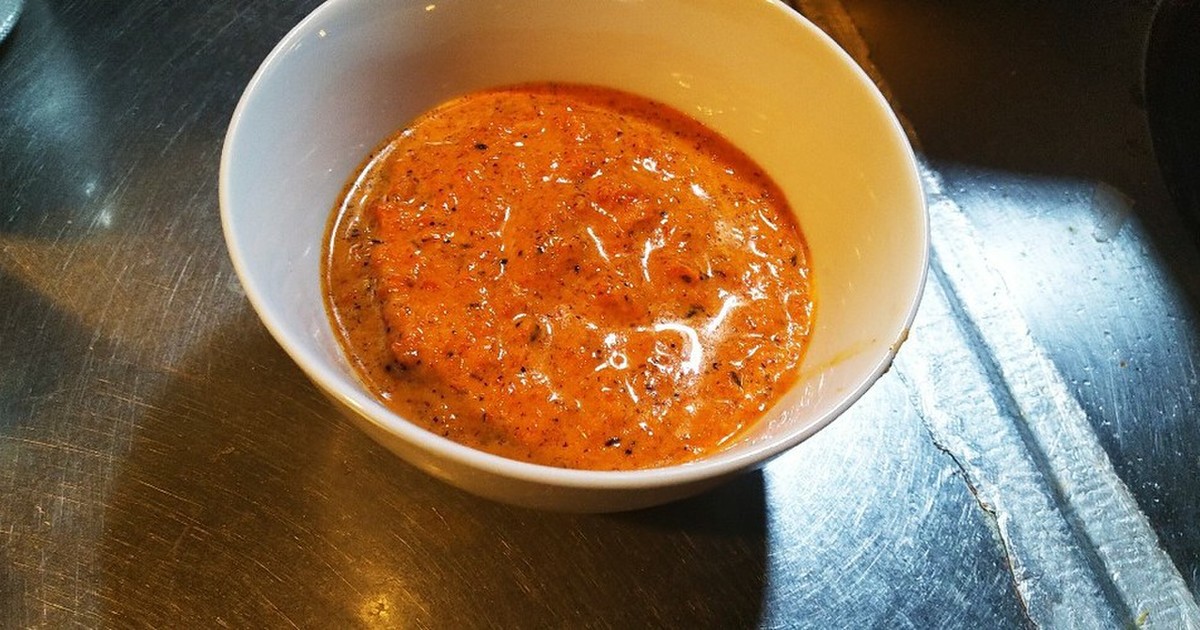 6。ブレンダーにパプリと5をいれつぶします。最後に塩、胡椒で調味します。