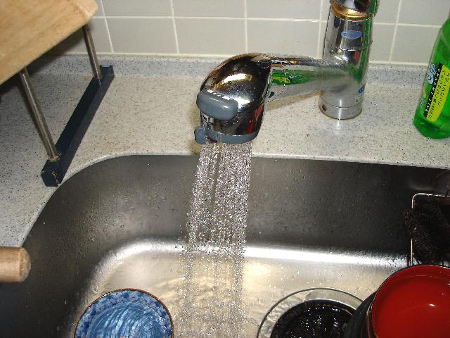 流し台の蛇口をシャワー側にし、お湯を節約モードで出したところを、シャッター速度1/200秒で写しました。