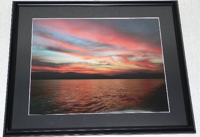 壁の上部にNEMOさんから頂いた四つ切の佐渡夕焼け写真と黒鯛の魚拓を飾りました。