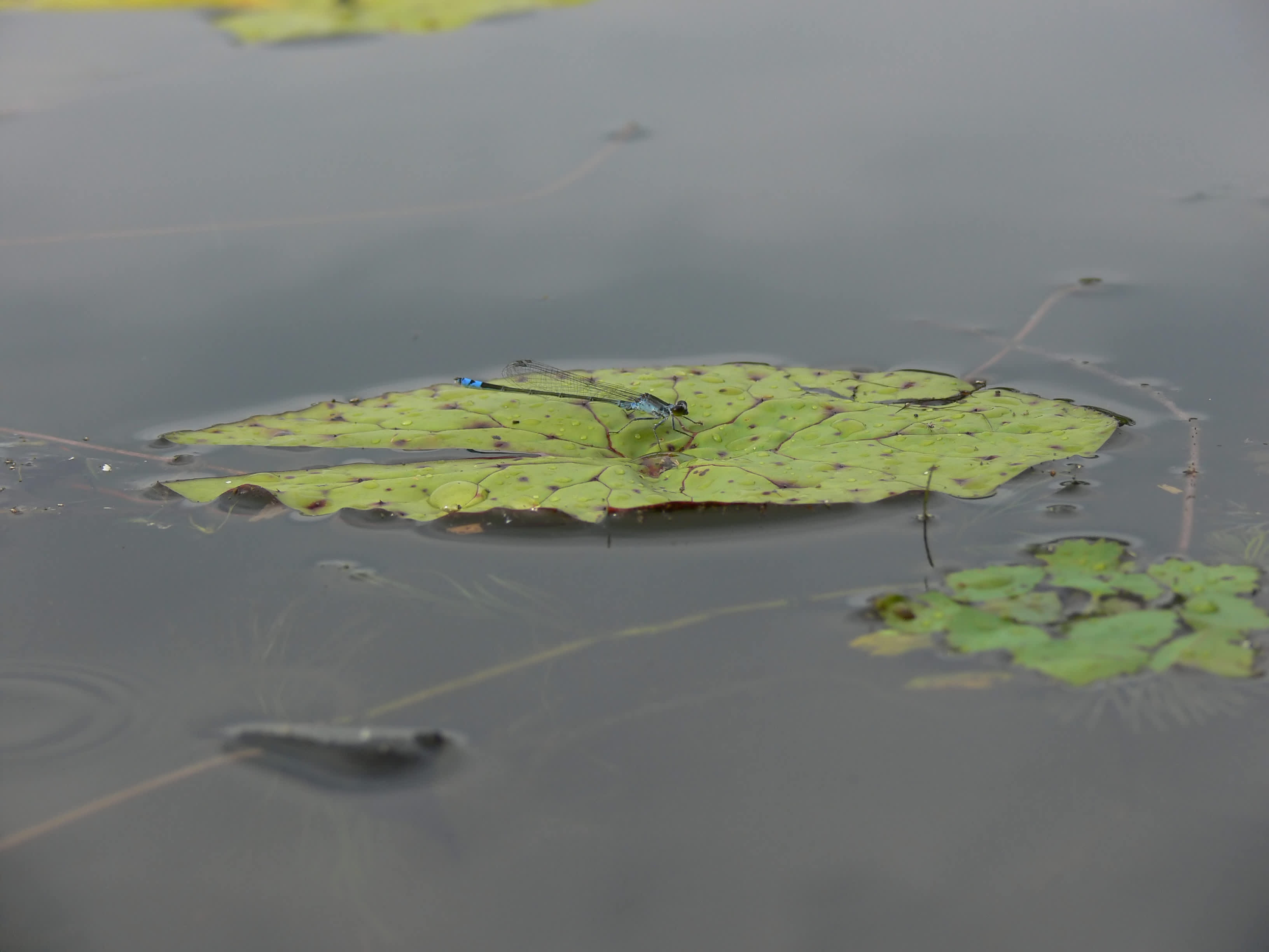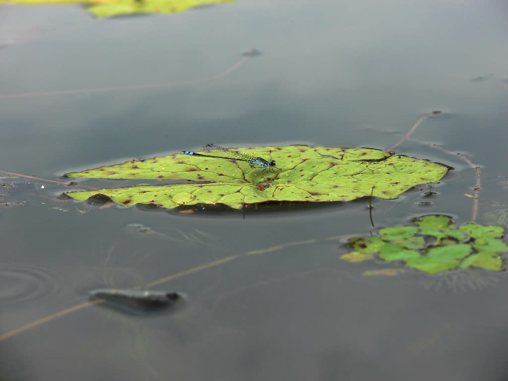 *この写真は、池の岸に膝をついて左手でカメラを水面近くに持って行き、フリーアングルモニターを覗きながら、シャッターリモコンを右手に持ち、オニバスにピンとを合わせて待機、イトトンボが止まるまでジッと我慢、止まった瞬間に写しました。