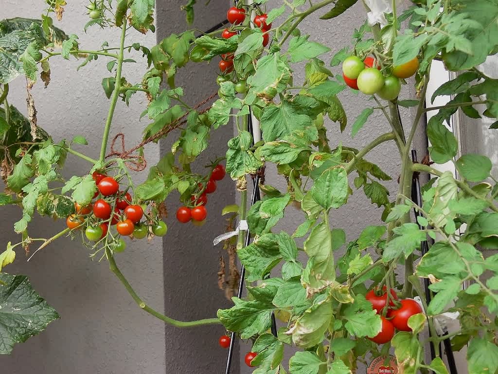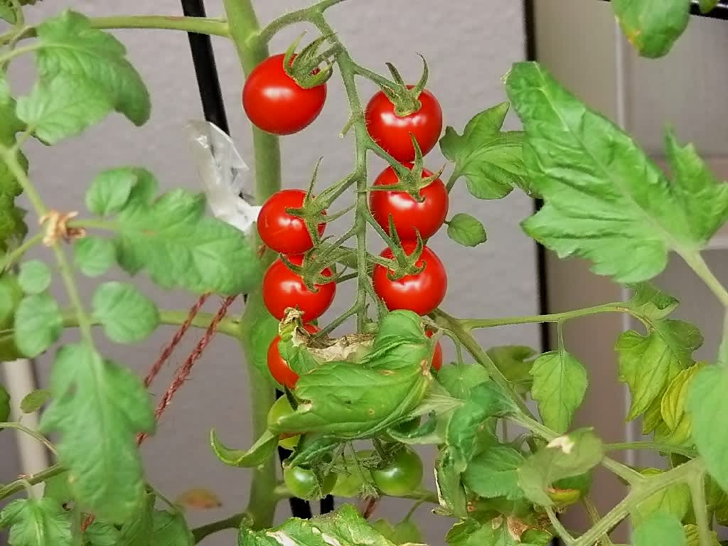 チョッと前の大風でツルや枝がメチャクチャになり葉っぱも茶色く枯れたみたいになっていたので諦めかけていましたが、赤いトマトがたくさんぶら下がっていたので嬉しかったです。