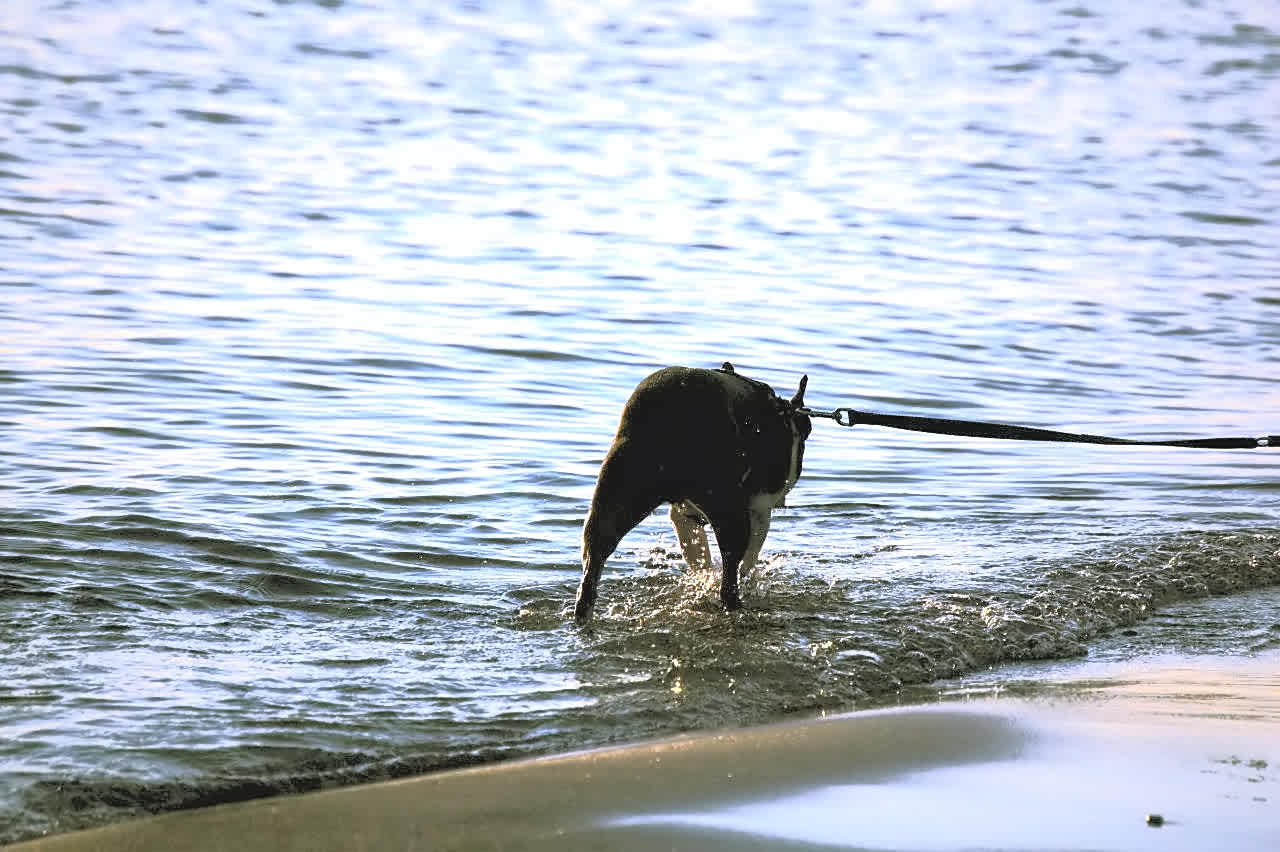 ↓夕日を浴びて波と戯れるワンちゃん