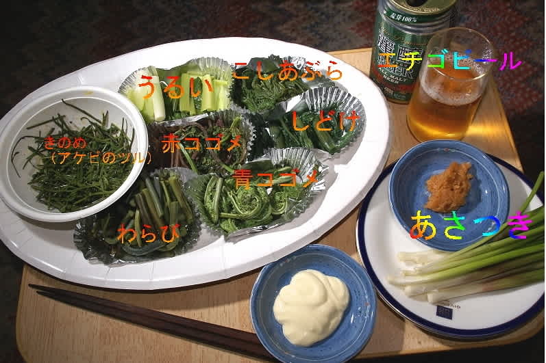昔わたしが北魚沼の守門の会社に勤めていた頃、会社の人から連れて行ってもらい、木の芽(アケビのツル)、山ウド、山たけのこ、あさつき、ウルイなど・・・